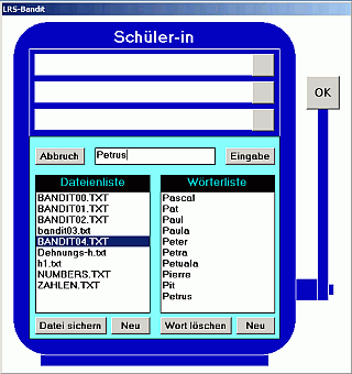 In der neuen Version ist jetzt eine Dateiauswahl eingearbeitet, die die alte starre Dateienliste ablöst. Die Auswahlfenster lassen sich verbreitern, damit auch lange Dateinamen in der 32Bit-Version gut zu lesen sind und die Schüler am ausführlichen Dateinamen den Inhalt der Listen erkennen können.